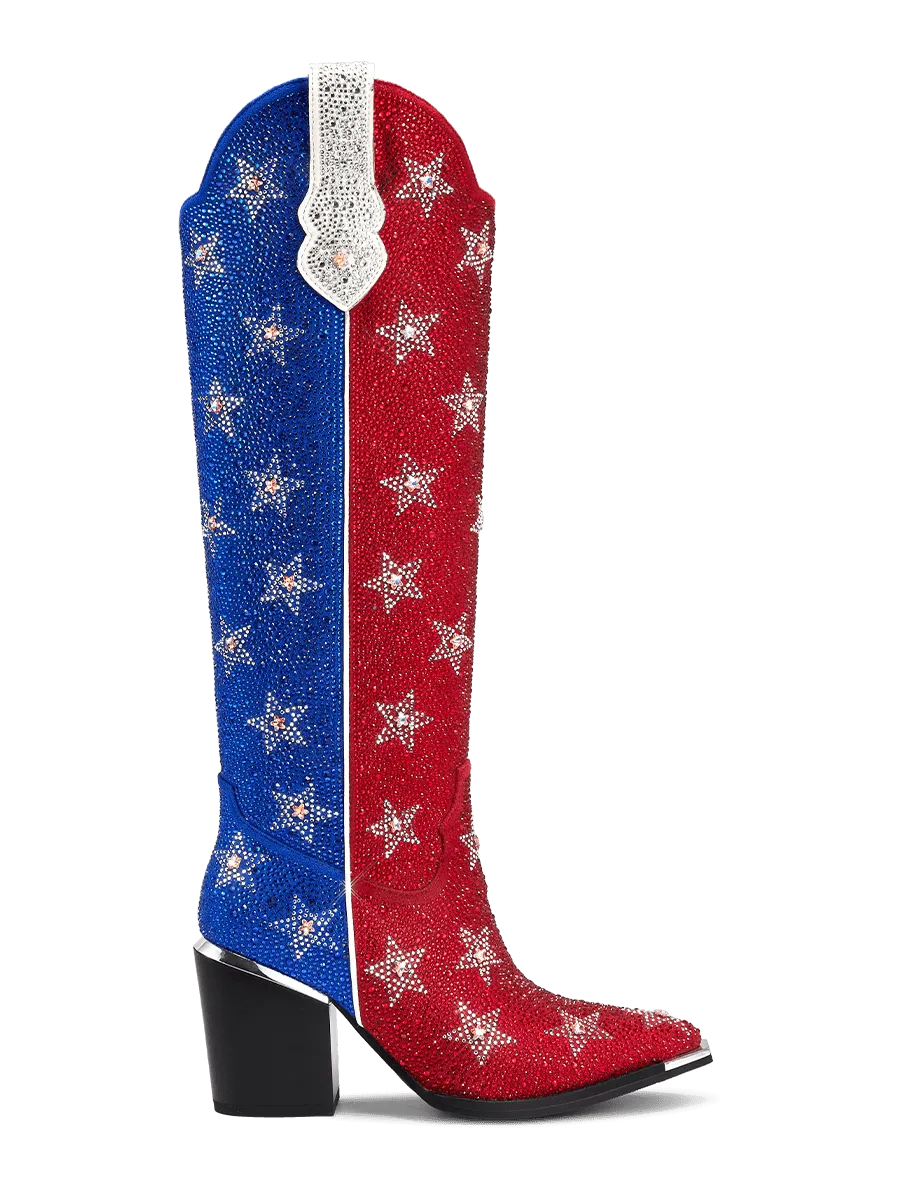 Yeehaw but make it sparkle 🤠✨ — these Star Rhinestone Cowboy Boots are here to turn every sidewalk into your personal stage. Crafted from soft faux suede in bold red + blue and decked out with shimmering rhinestone stars, they’re Western charm with a glam upgrade.