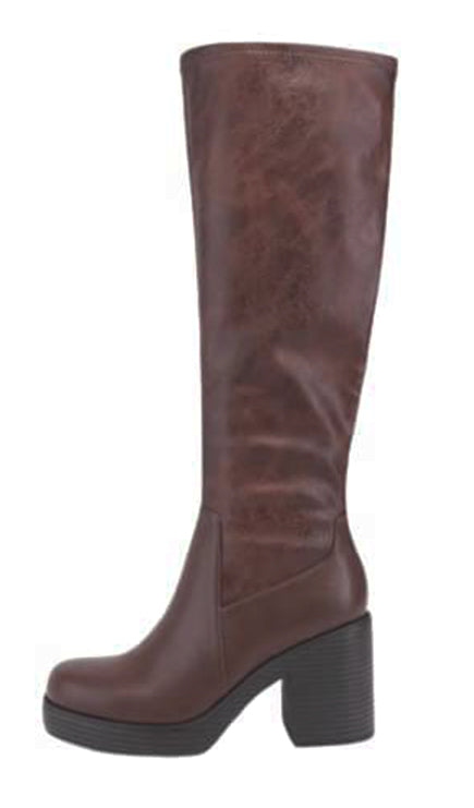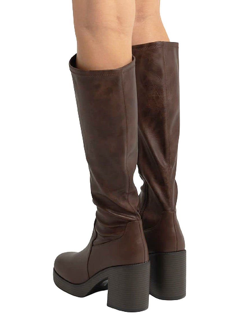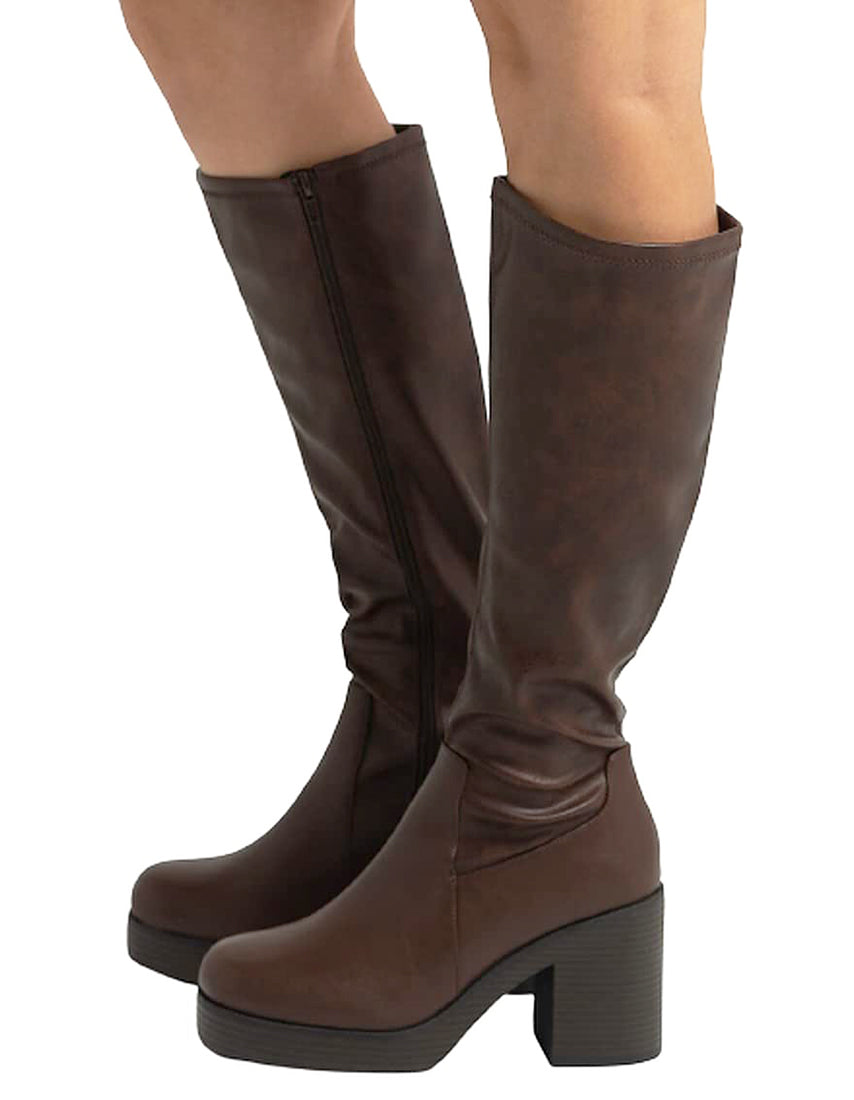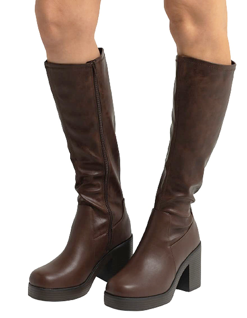 Sonia-H Chunky Heel Knee-High Boots – Brown Faux Leather Fierceness