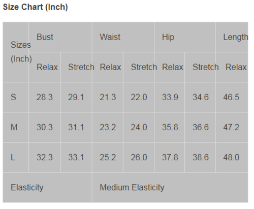 Size | Bust (Relaxed–Stretch) | Waist (Relaxed–Stretch) | Hip (Relaxed–Stretch) | Length |